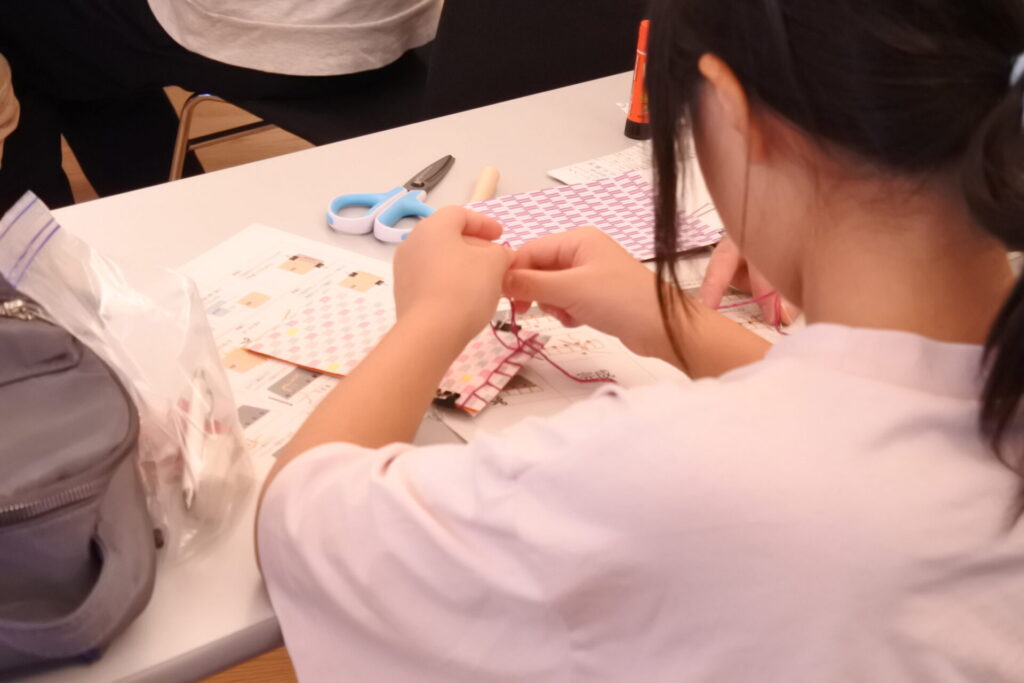 いよいよ和綴じの本の制作です! 表紙、裏表紙になる画用紙を選んだら、型紙を当てて切ります。中に白い紙束をはさみ、千枚通しで6つの穴を開けます。針に糸を通し、お手本の紙を見ながら穴に針を通していきます。苦戦しながらも、全員が思い思いのミニ本を完成させました!