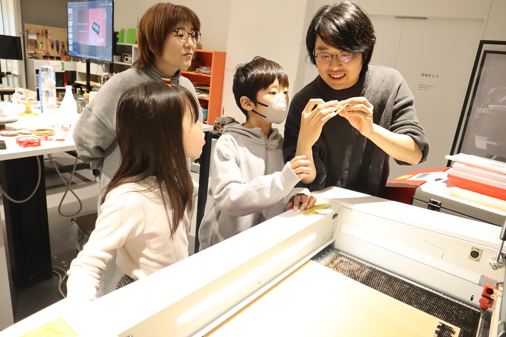 パソコンを使って、デザインした絵や文字をアクリル板にレーザー加工し、3Dプリンターで印刷したケースと専用の電子回路基板から「光るペンダント」を組み立てます。ワークショップを通して、レーザー加工機・3Dプリンターなどでデジタルのものづくりを体験します。