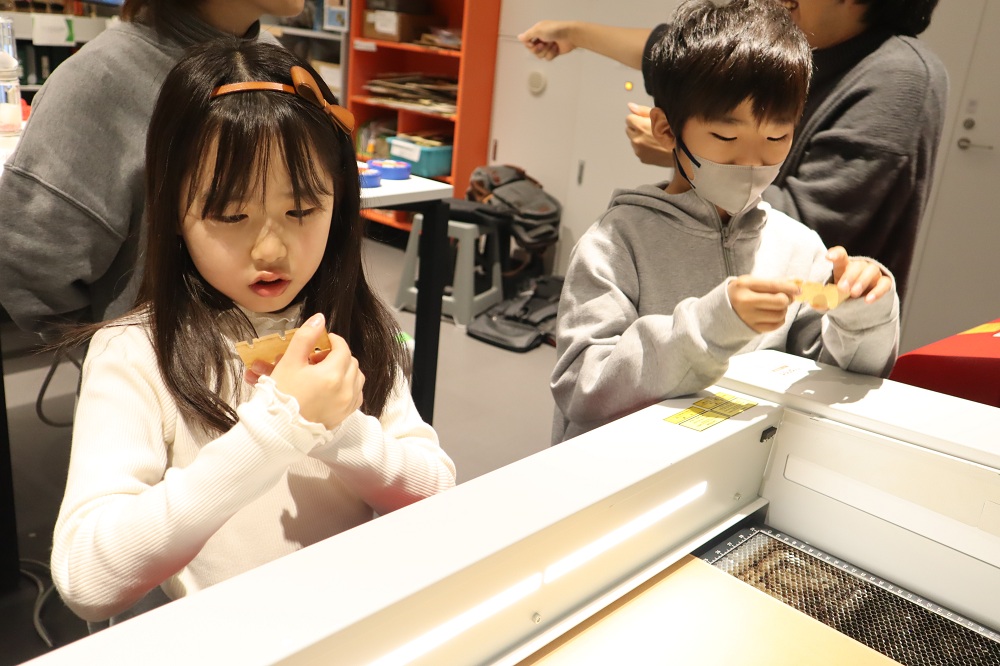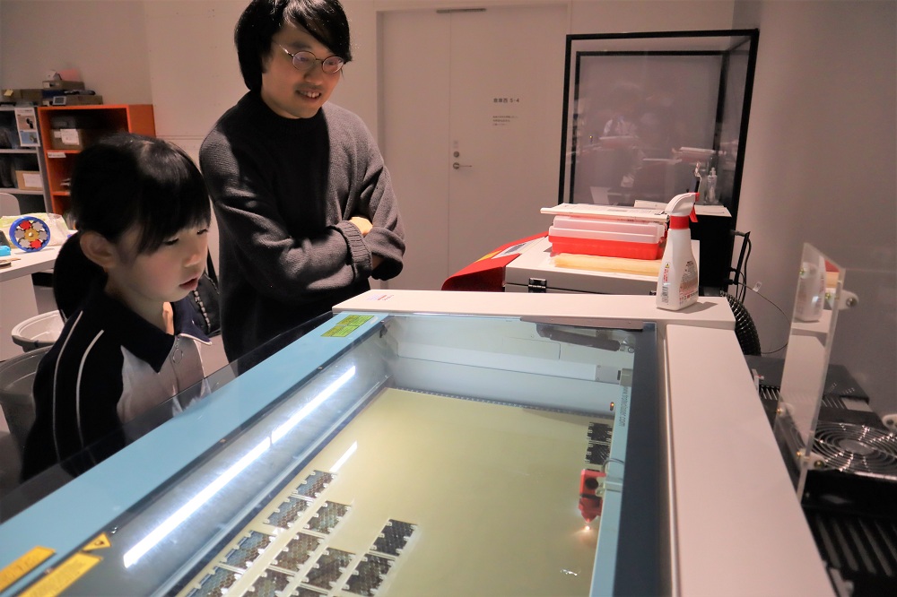 その後、皆さんが作ったデザインのデータをレーザー加工機に送り、加工の工程に移りました。約300℃のレーザーがアクリルパネルを切ったり溶かしたりしていく様子に興味が尽きない様子でした。
