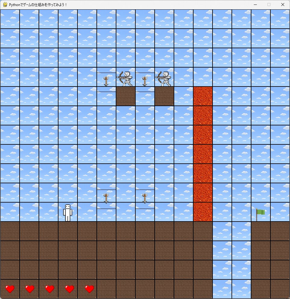 キーを押したらキャラクターが動く! 旗を取ったらステージをクリアする! 矢に当たったら体力が減る!お肉を取ったら体力が回復する! マグマに入ったら何回もダメージを受ける!! 変数とif文を使ったゲームのしくみを、Pythonで一緒に作りましょう!