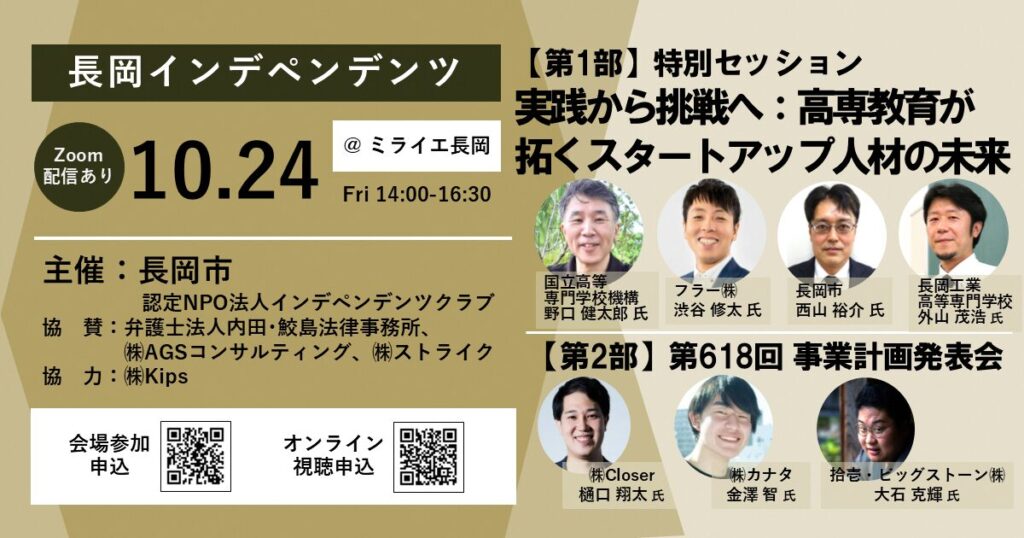 内容 | 第1部 パネルディスカッション 「実践から挑戦へ: 高専教育が拓くスタートアップ人材の未来」 <パネラー> 野口 健太郎 氏(独立行政法人国立高等専門学校機構 本部事務局 学務参事) 渋谷 修太 氏(フラー株式会社 取締役会長) 西山 裕介(長岡市商工部長) <モデレーター> 外山 茂浩 氏(長岡工業高等専門学校 副校長) 第2部 事業計画発表会 ㈱Closer 共同創業者/代表取締CEO 樋口 翔太 氏 ロボット等の開発、販売、導入 ㈱カナタ 代表取締役社長 金澤 智 氏 デザイン制作・提供 拾壱・ビッグストーン㈱ 代表取締役 大石 克輝 氏 サイクロイド減速機の開発及びそれを活用したアクチュエーター製品の設計・開発 |