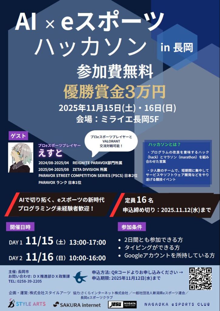 参加者でチームを組み「eスポーツ」に関するAIアプリ開発を競う「AI×eスポーツハッカソンin長岡」を開催します。