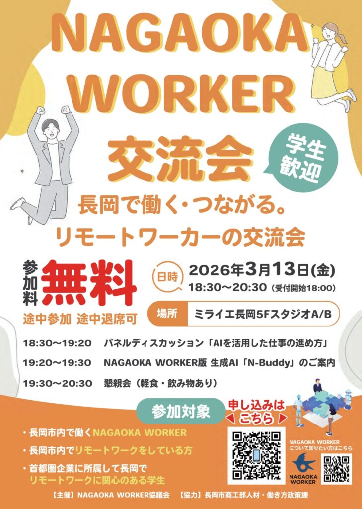 「NAGAOKA WORKER」という働き方に興味のあるリモートワーカーの方、学生の方はぜひご参加ください!