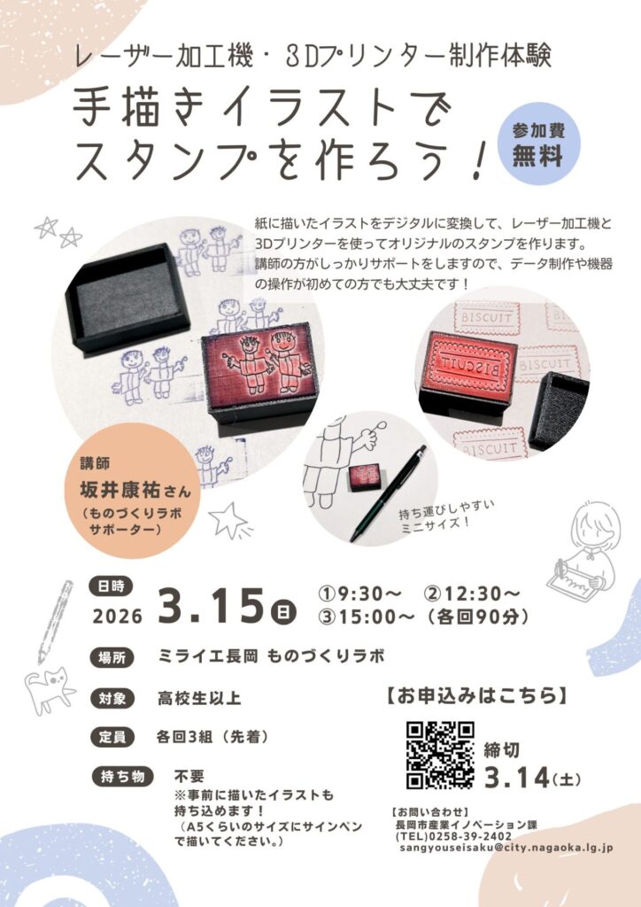 【3/15開催】レーザー加工機・3Dプリンター制作体験 手描きイラストでスタンプを作ろう!