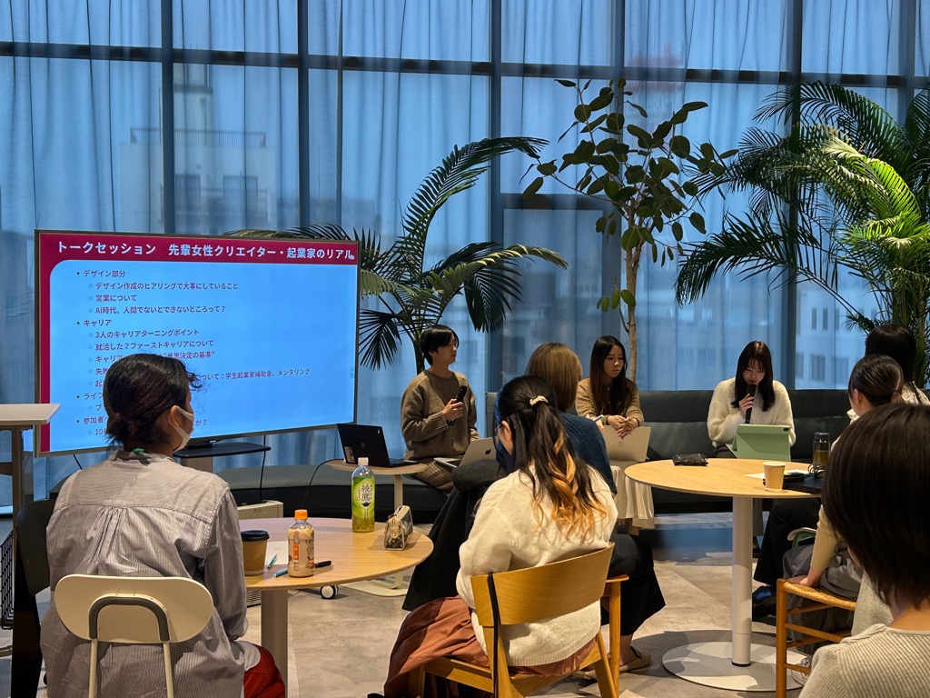 第2回は講師・株式会社Wakumiの椎名愛実様のほか、先輩女性起業家である山田準子さん(長岡造形大学卒)安宅理彩さん(長岡造形大学学生) をゲストに迎え、3人のこれまでのキャリアや今後のキャリアプランについてクロストークをしていただきました。
